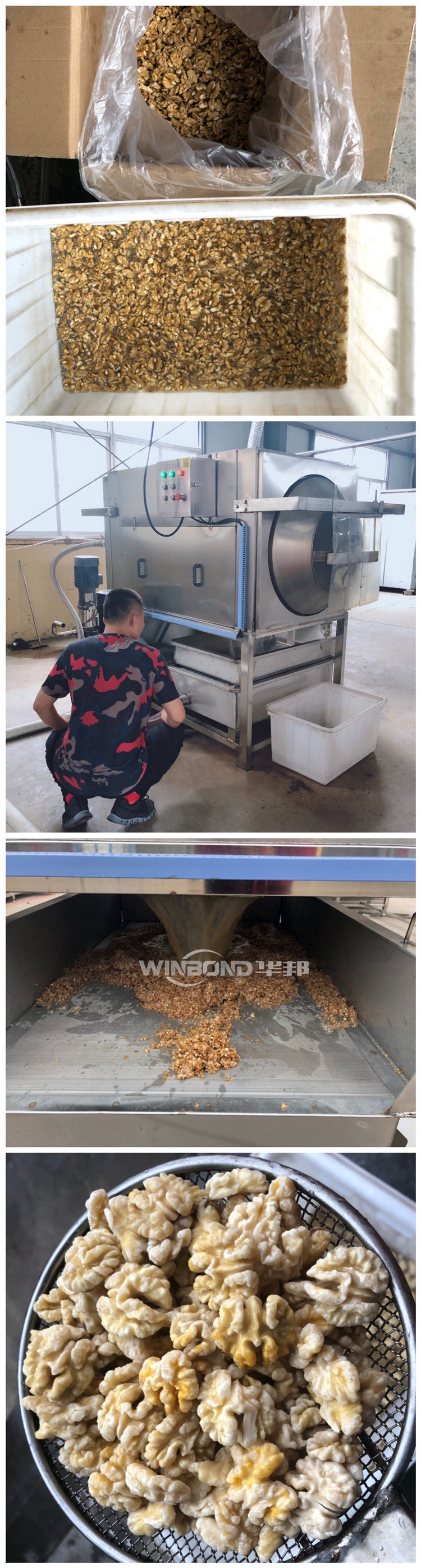 核桃仁去皮流水線由提升機,核桃仁去皮機,核桃仁清洗機,烘干機等設備組成,成套流水線自動化程度高,1-2人操作即可,效率高,產量大,符合大中型企業(yè)生產制造,設備采用物理清水去皮,(如果需要用堿浸泡,效率更高)保持了核桃仁自身的美味口感。