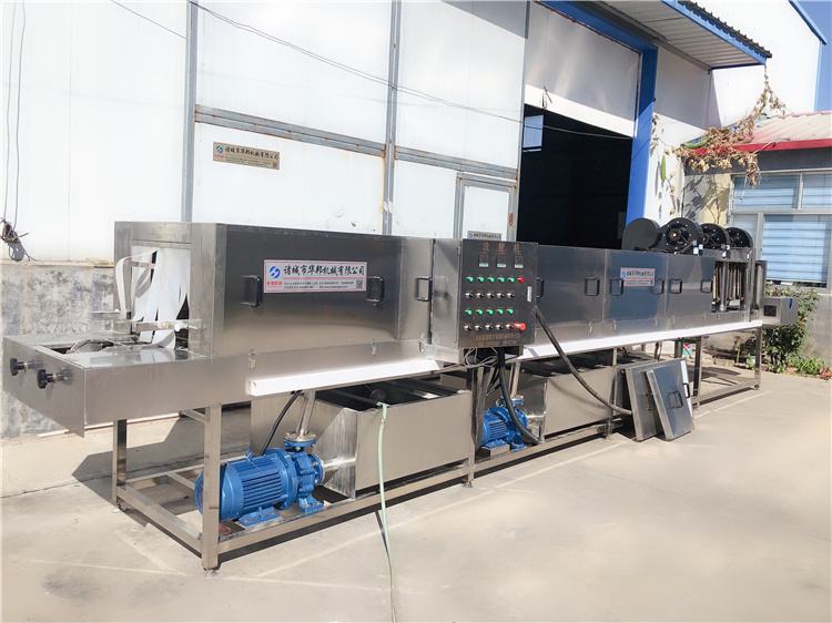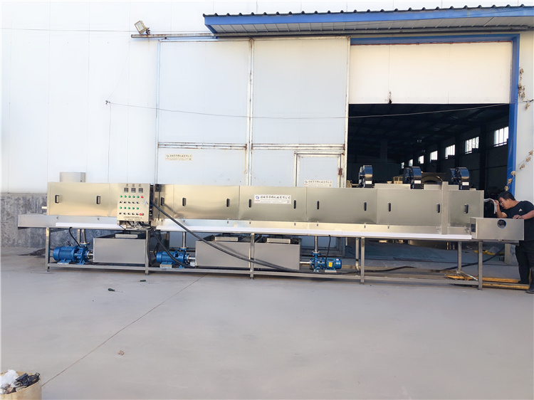 需清洗的周轉(zhuǎn)筐由不銹鋼鏈條輸入清洗機(jī)中,依次通過加溫堿水、高壓熱水、常溫自來水消毒水、常溫風(fēng)刀去水等多道工序,將筐子清洗干凈,同時完成殺菌及風(fēng)干;特殊筐子清洗時可在熱堿水清洗段后加配毛刷,對筐子底部及左右兩側(cè)進(jìn)行刷洗,提高清洗效果;采用連續(xù)式清洗,以提高清洗效率;