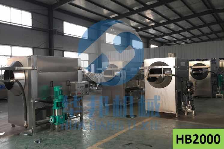 使用全自動輸送機,輸送到脫皮機內(nèi),然后采用高壓循環(huán)水泵,高壓噴淋系統(tǒng),變頻調(diào)速、自動翻料、自動出料!