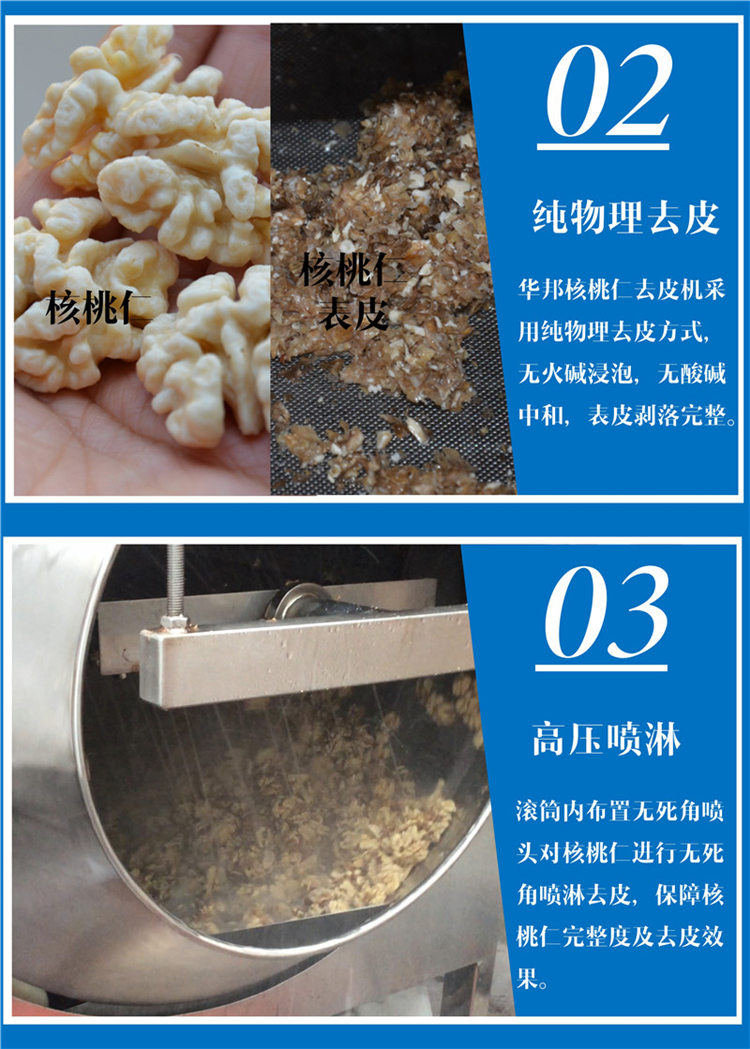 采用特殊設(shè)計(jì)的脫皮原理,脫皮過程中,核桃仁完全不經(jīng)過刀片及硬度磨擦用,所以能確保加工物之完整性、新鮮度及無(wú)污染。