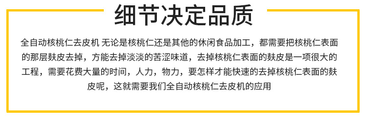 核桃深加工時(shí),需要去掉核桃仁外層的薄皮以脫除苦澀味道。以前工藝較為落后,目前諸城華邦機(jī)械的本項(xiàng)創(chuàng)新解決的技術(shù)問題是給廣大核桃產(chǎn)業(yè)提供一種大幅度提高生產(chǎn)效率、節(jié)約用人、純物理脫皮均勻干凈,自動(dòng)化程度高,不破壞核桃仁內(nèi)在品質(zhì)營(yíng)養(yǎng)成分,不爛、不碎、不損害外形,果仁完整。