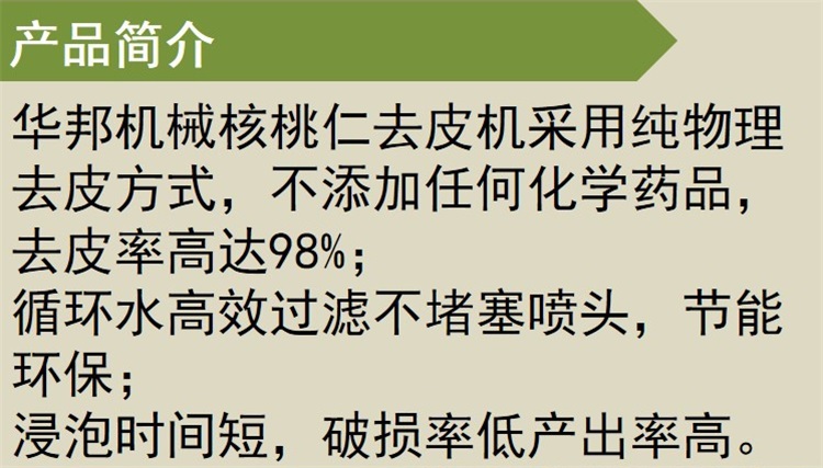 華邦機械十年的制造經驗,根據多年來的研發(fā),試機,客戶的要求進行不斷的完善!最終研發(fā)出了第五代核桃仁去皮機 ,自動進料。加大產量,縮短去皮的時間,更容易的將核桃仁皮完全去除!