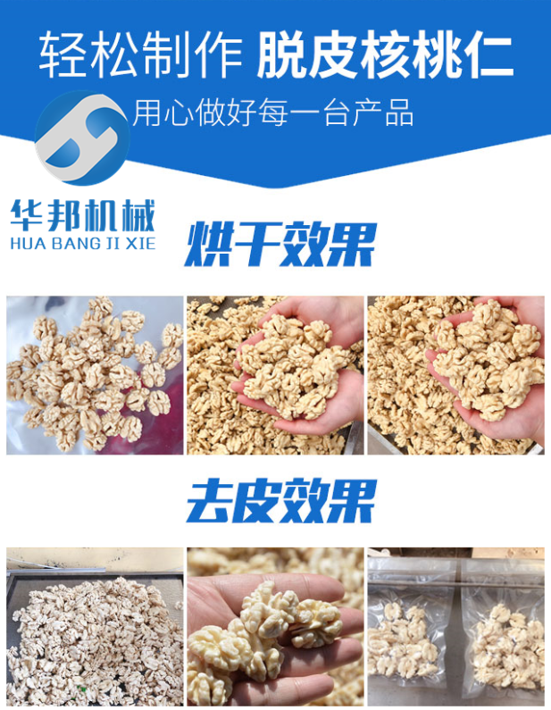華邦核桃仁去皮機,專門針對核桃仁發(fā)苦發(fā)澀薄皮去除,去皮率高達98以上,并且果仁完整,設備采用滾筒設計,占地面積小,產(chǎn)量大,小型去皮機60kg/小時,中型去皮機100kg/小時,大型200kg/小時。型號齊全,支持加工定制,滾筒式設計,大大減小了核桃仁的破損率。核桃仁去皮,我公司經(jīng)驗豐富,技術成熟,我公司的技術可以去掉各種品種的核桃仁,例如綠蕾核桃,185核桃,河北核桃,山西核桃,焦作核桃,陜西核桃,云南核桃,老樹核桃,鐵核桃,新疆核桃等,我們都有豐富的脫皮經(jīng)驗,免費試機。